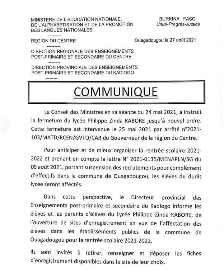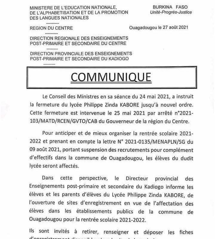 Le gouvernement annonce que les élèves du Lycée Philippe Zinda Kaboré seront affectés dans d’autres établissements de la capitale Burkinabè en témoigne ces communiqués ci dessous 👇👇👇👇 inforapide.bet