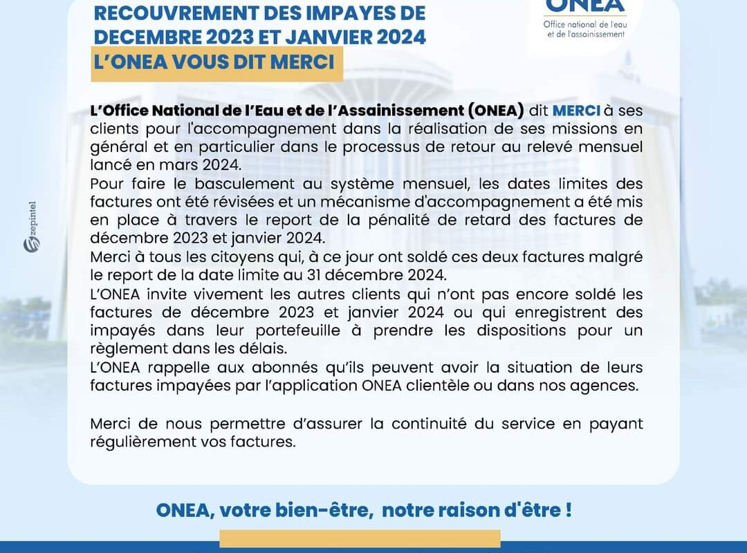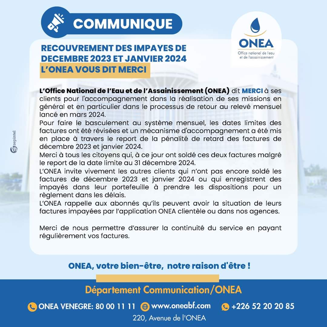 L’Office National de l’Eau et de l’Assainissement (ONEA) dit MERCI à ses clients pour l’accompagnement dans la réalisation de ses missions en général et en particulier dans le processus de retour au relevé mensuel lancé en mars 2024.
