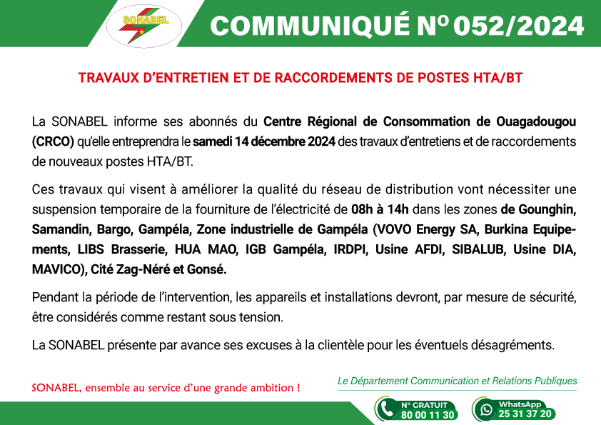 La SONABEL informe ses abonnés du Centre Régional de Consommation de Ouagadougou (CRCO) qu’elle entreprendra le samedi 14 décembre 2024 des travaux d’entretiens et de raccordements de nouveaux postes HTA/BT.